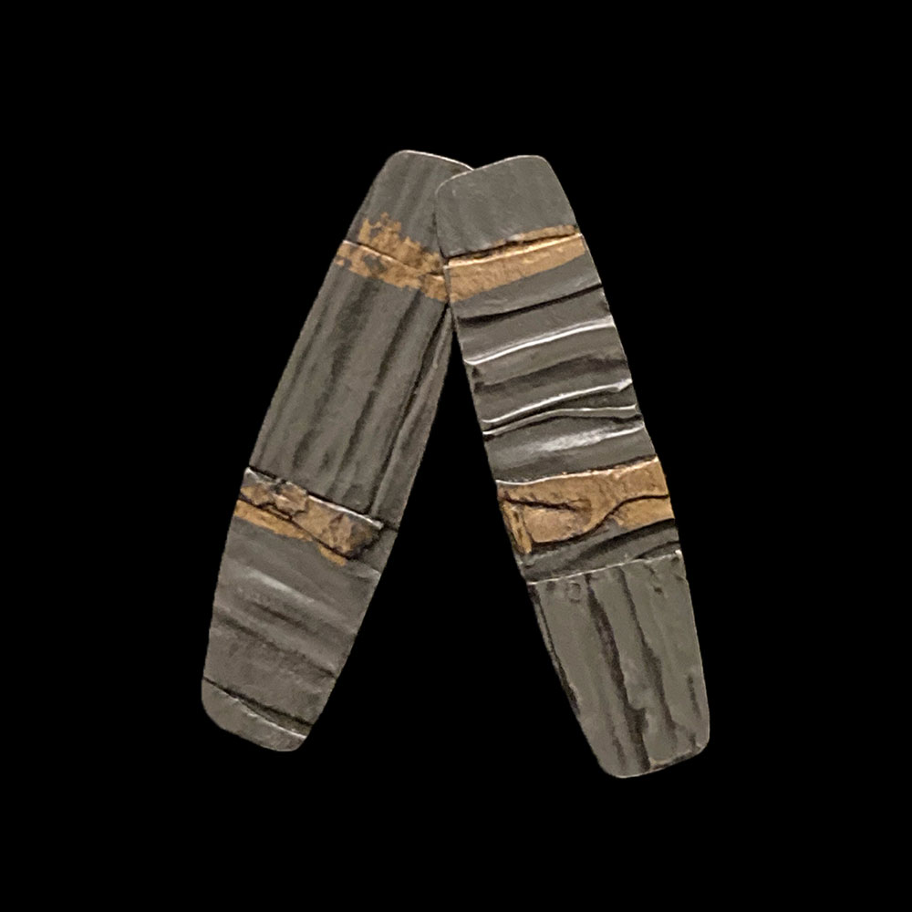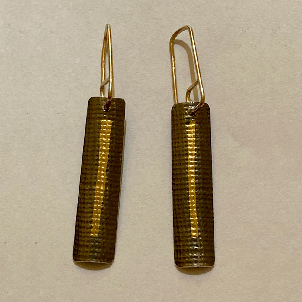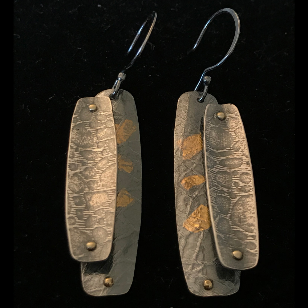 Oxidized and textured sterling silver post earrings 1 1/4” long with 24 kt gold keum boo