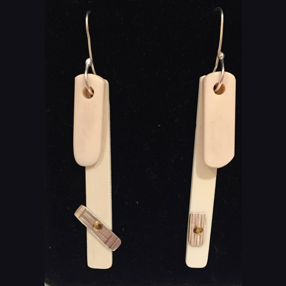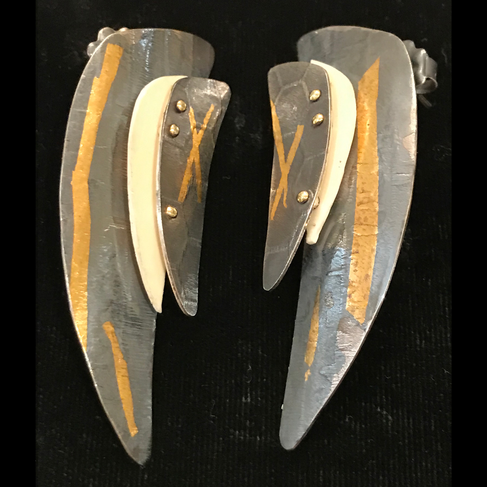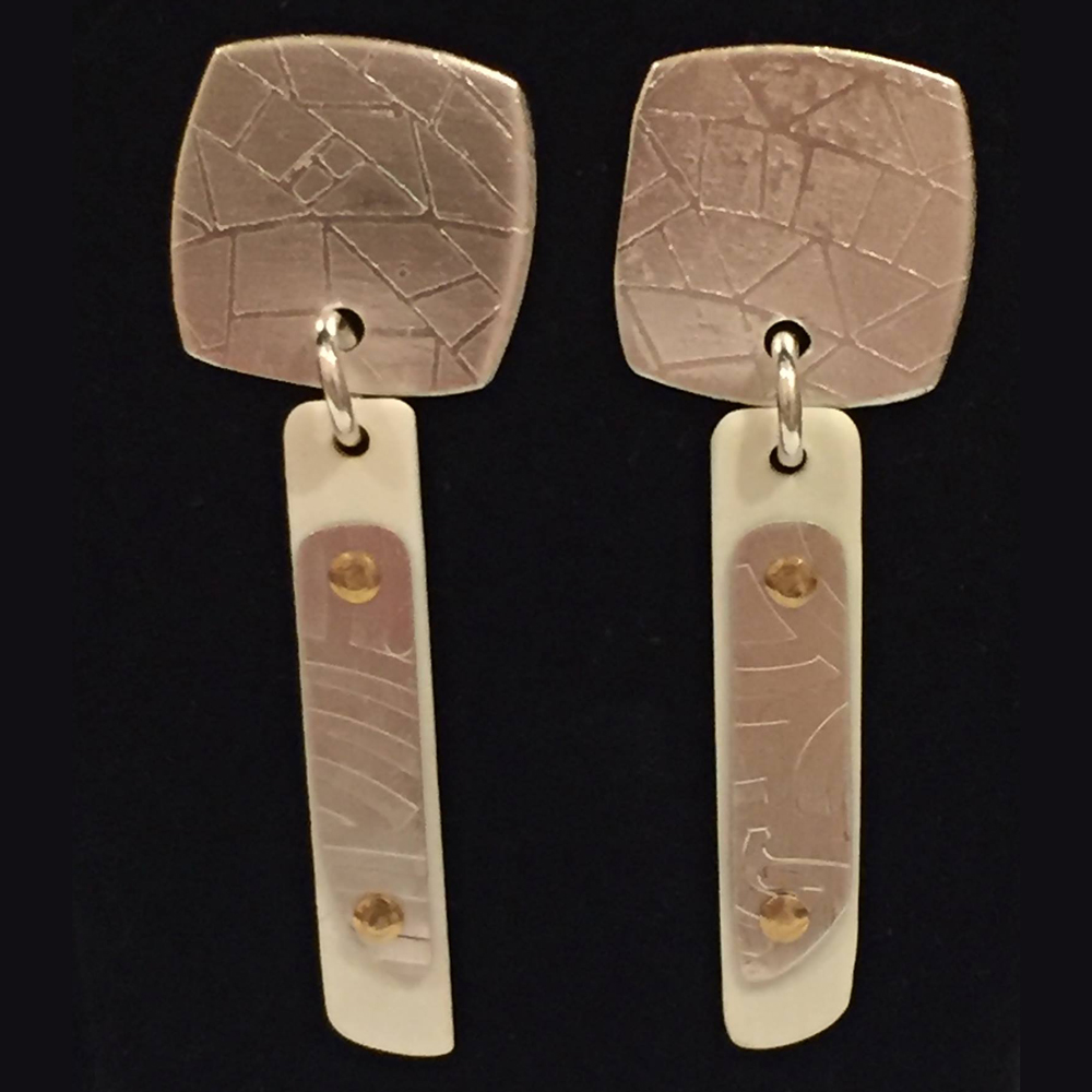 3 layer earrings with sterling silver posts, Oxidized roller printed fine silver, 24 kt gold keum boo and piano keys/ recycled ivory with rivets 3 1/8” x 3/4” (can be made on wires instead of posts if desired)