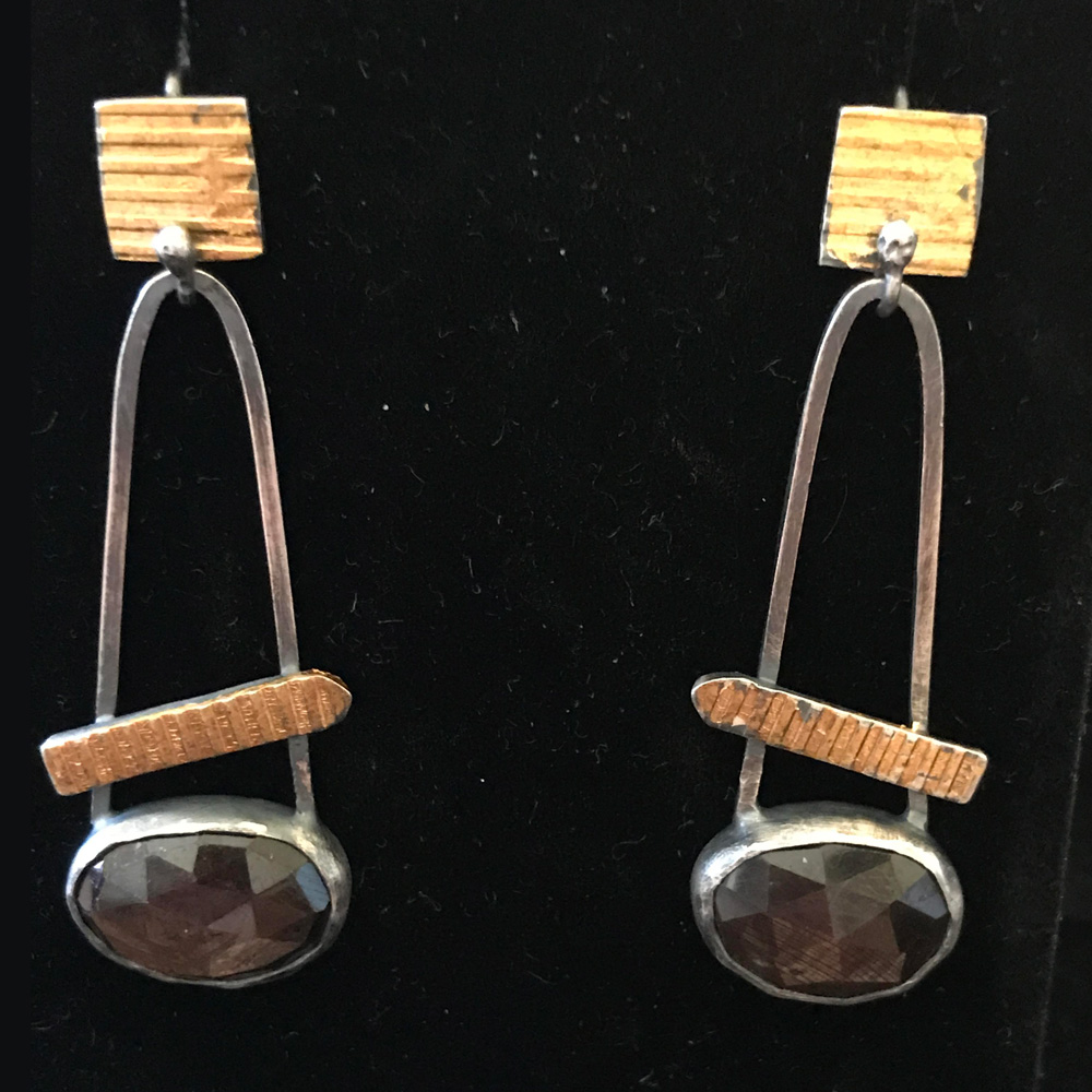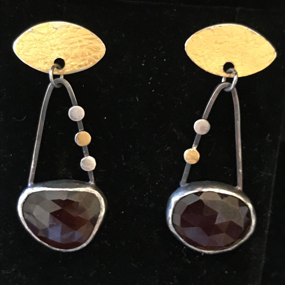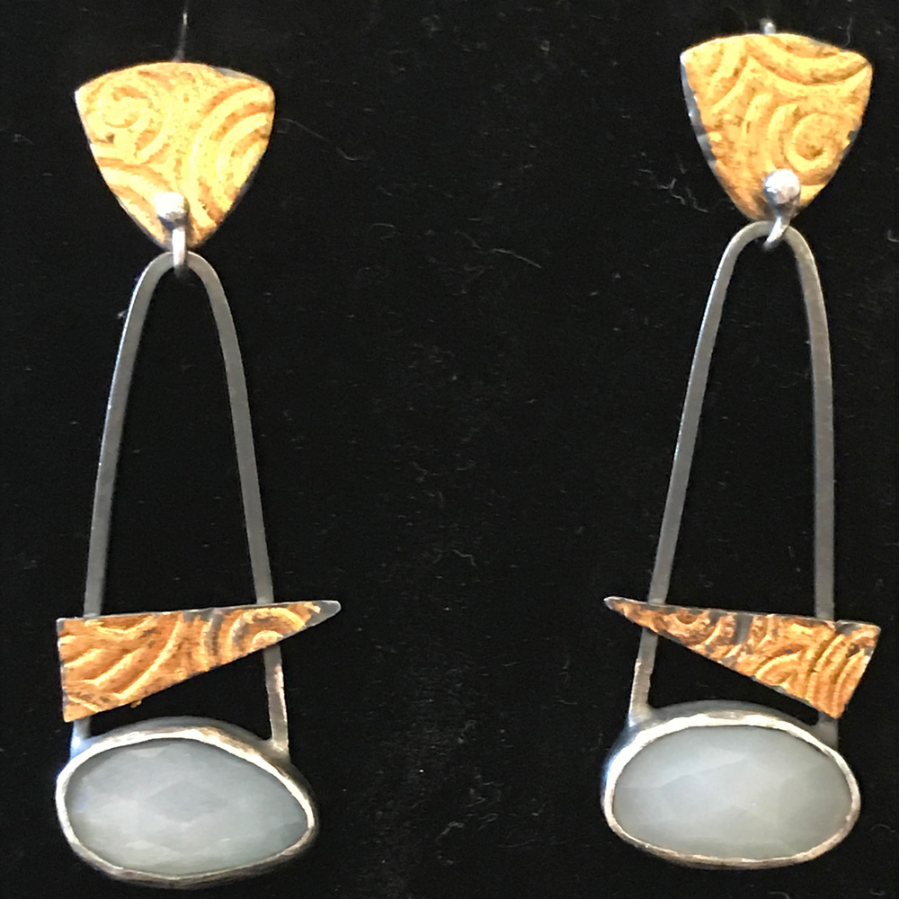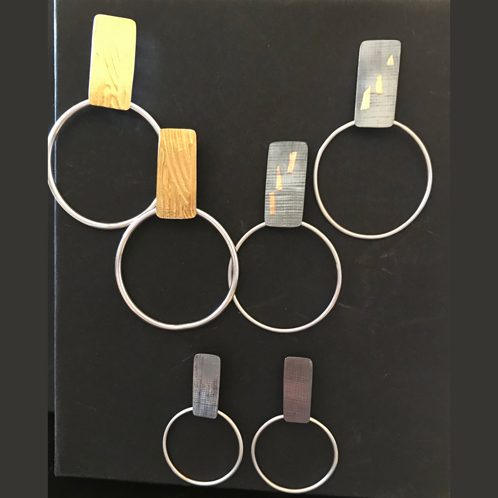 Top right: 2” long textured, oxidized, 24 kt gold keum boo and 1 1/4” sterling silver hoop $79