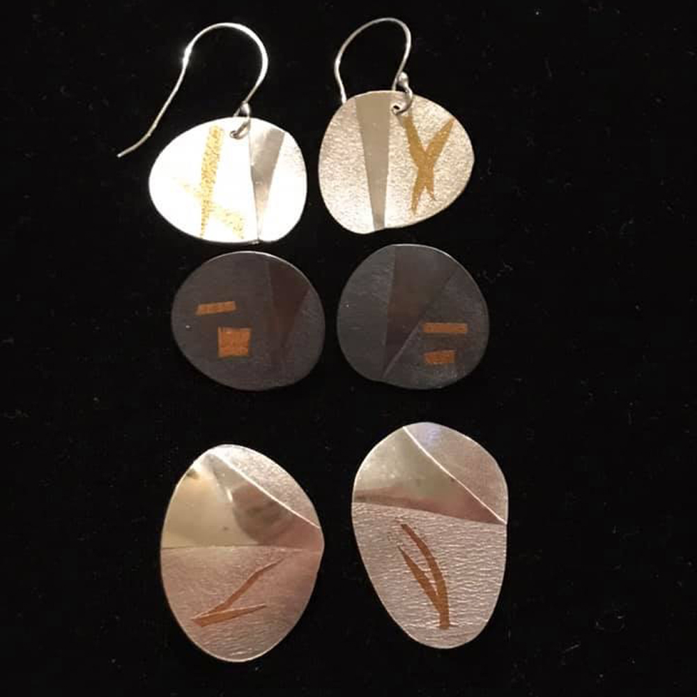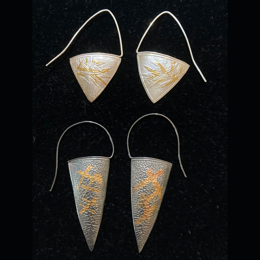 Top left: 2 1/4” long textured with 24 kt gold keum boo and 1 1/2” sterling silver hoop $129
