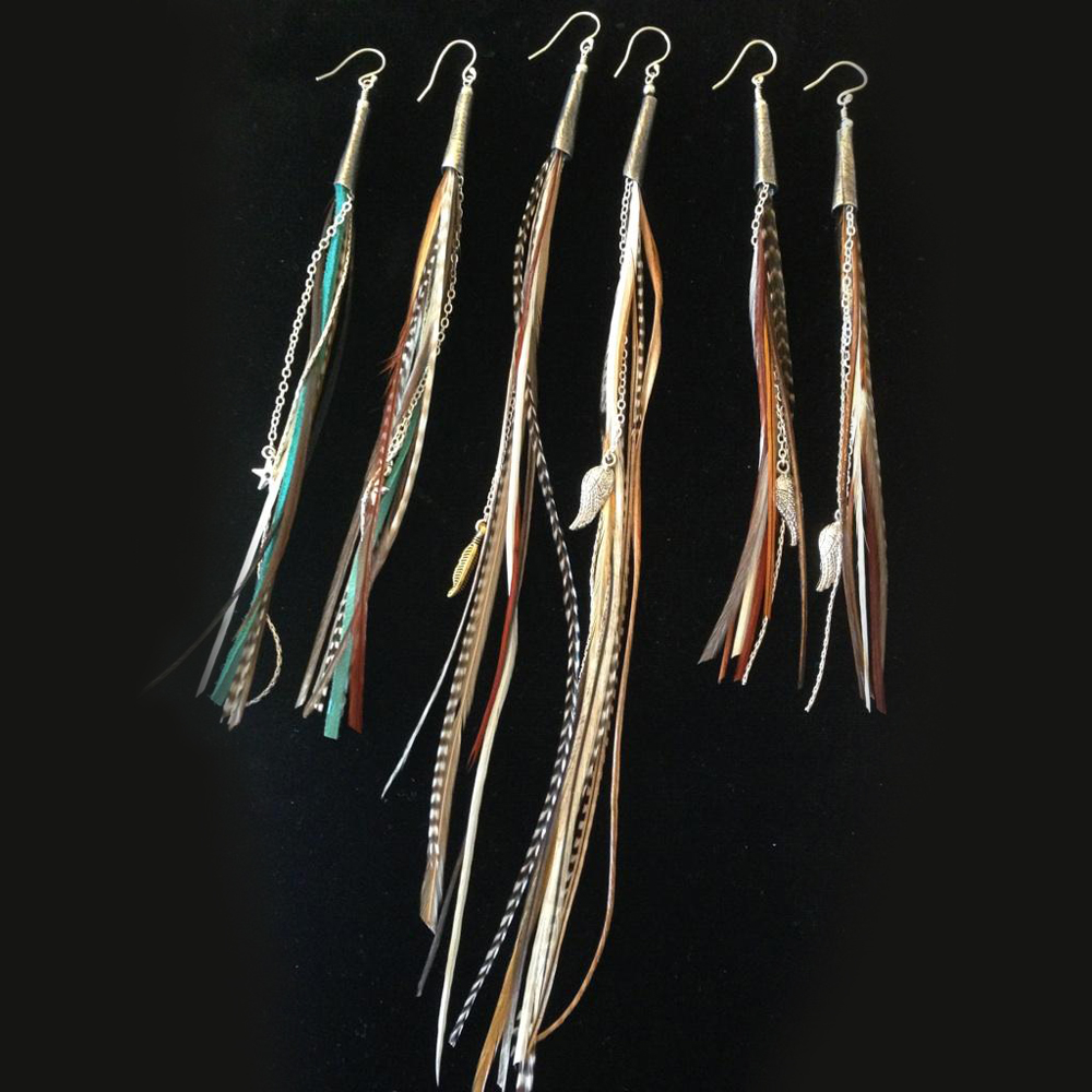 Real feathers with SS hand-made hammered cones, chains, suede, and charms