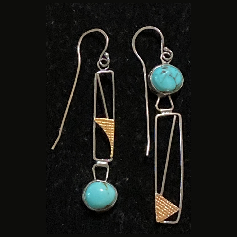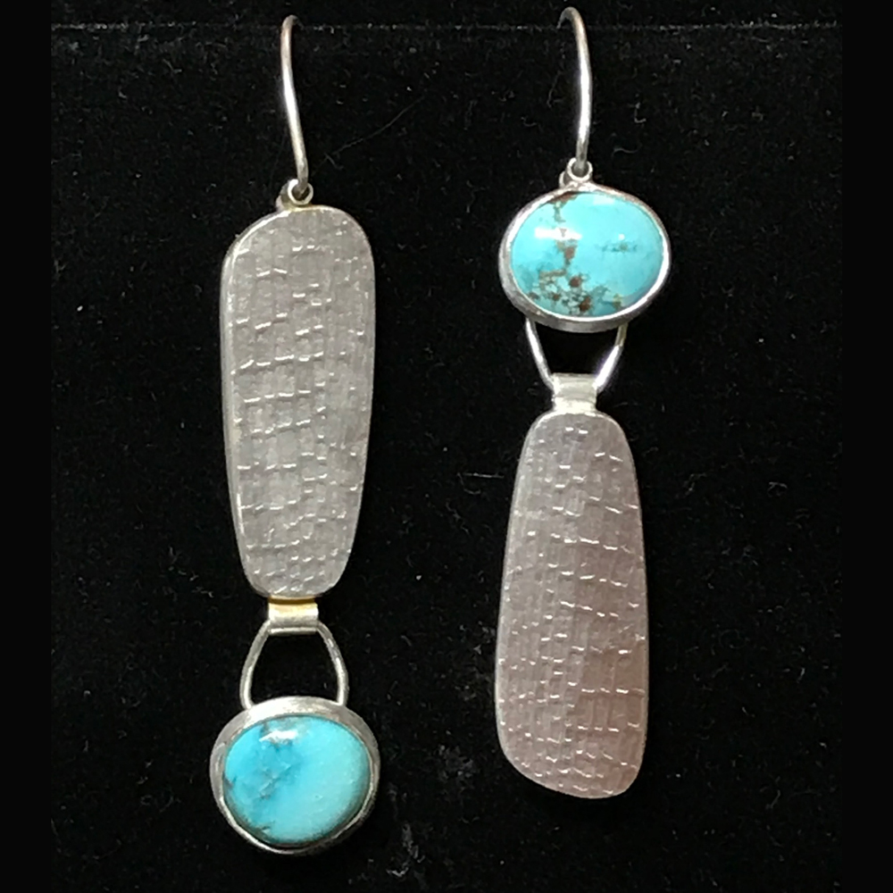 Sierra Nevada turquoise asymmetrical oxidized argentium silver earrings with 24 kt gold textured keum boo