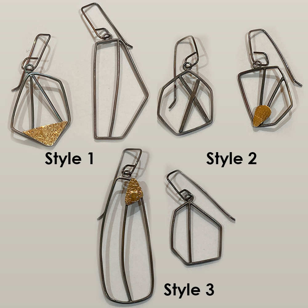 Choose posts (Top 2 pictures) or wires (Bottom picture) - shiny (Top left or bottom) or oxidized black (top right) - Each pair is one of a kind and will differ slightly
