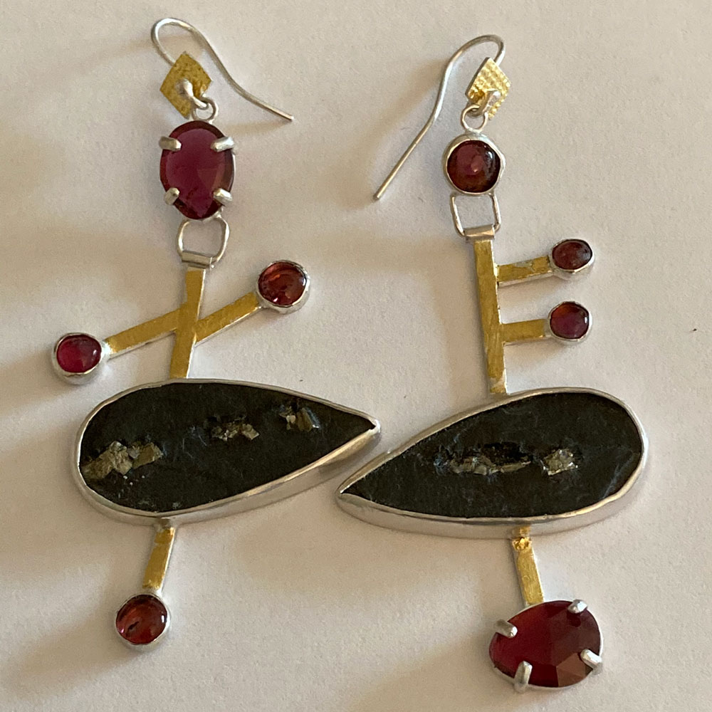 Slate and Pyrite teardrop stones with rosecut garnets, and pink tourmaline stones with 24 kt gold keum boo - One of a kind!