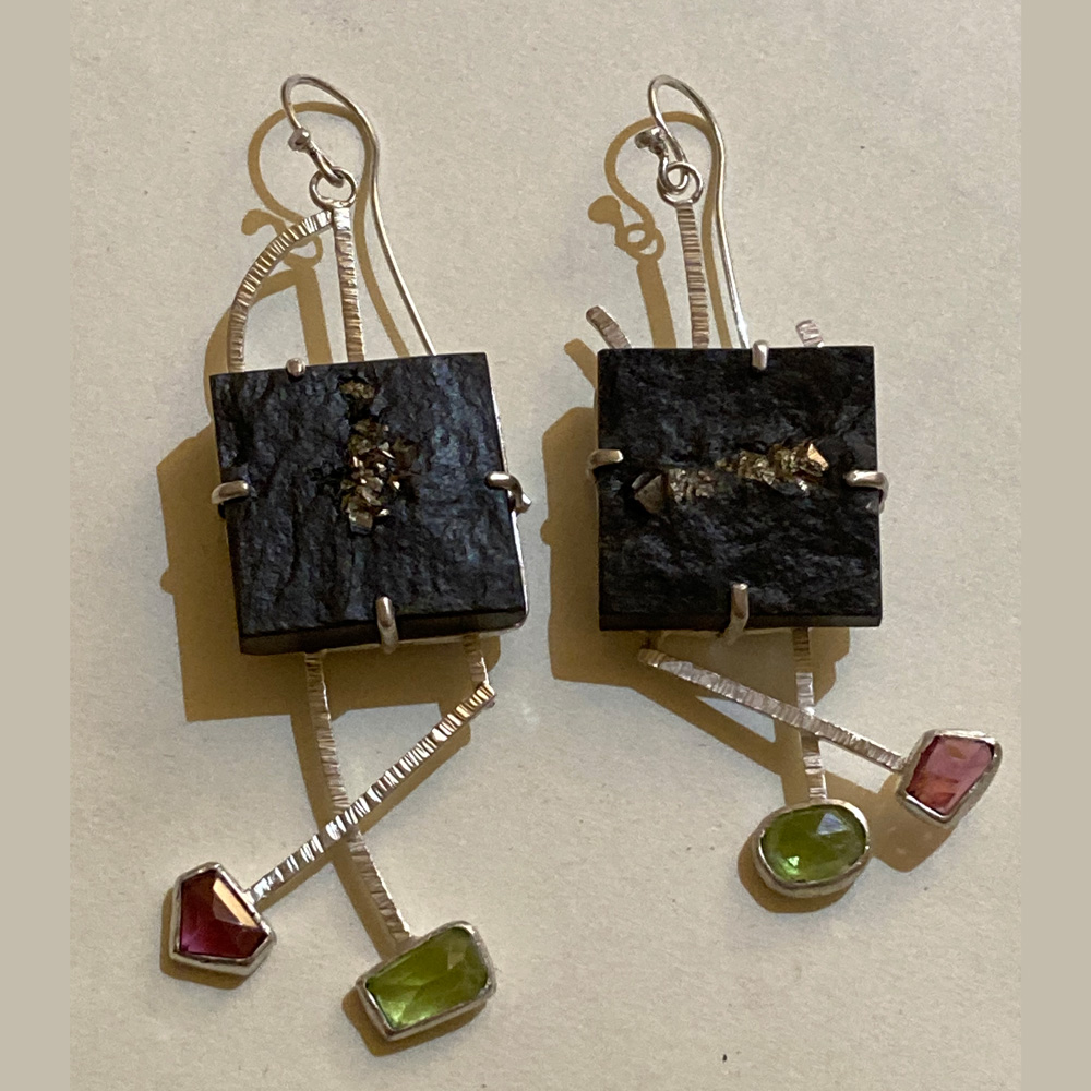 Earrings of Slate and pyrite square stones with peridot and garnets - one of a kind!