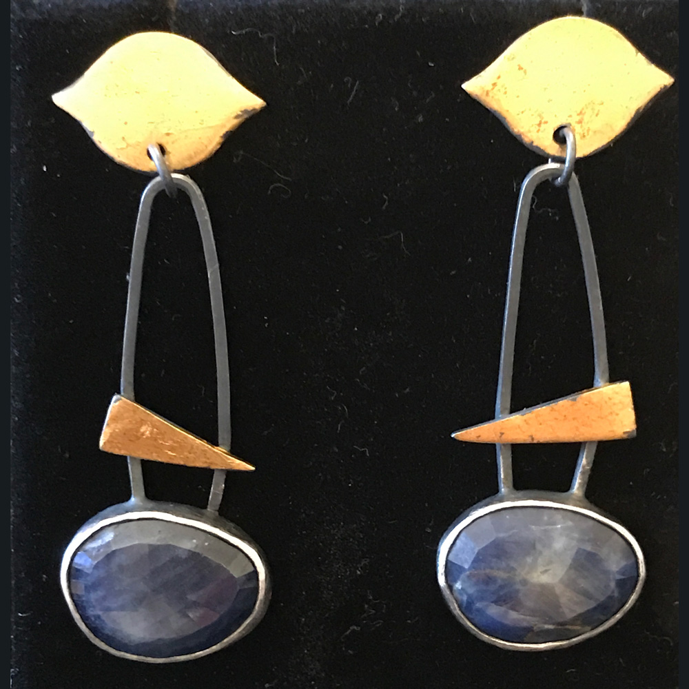 Blue Sapphire oxidized SS with 24 kt gold keum boo, rose cut stones, 2" long
