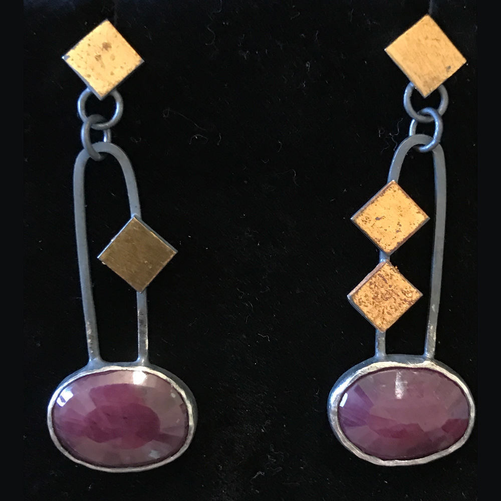 Ruby oxidized SS with 24 kt gold keum boo, rose cut stones, 2" long