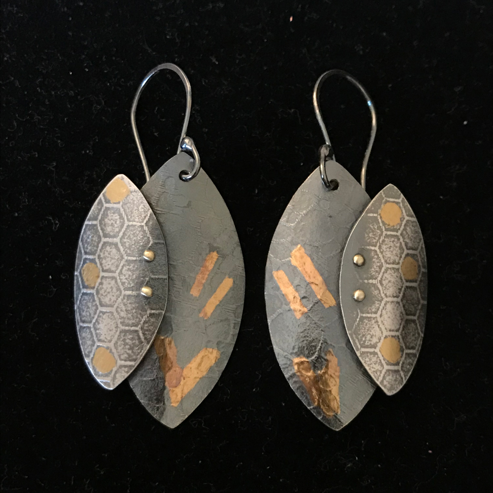 Oxidized fine silver and 24 kt gold keum boo earrings on wires 2 1/4” long (can also be made as posts 1 1/2” long)